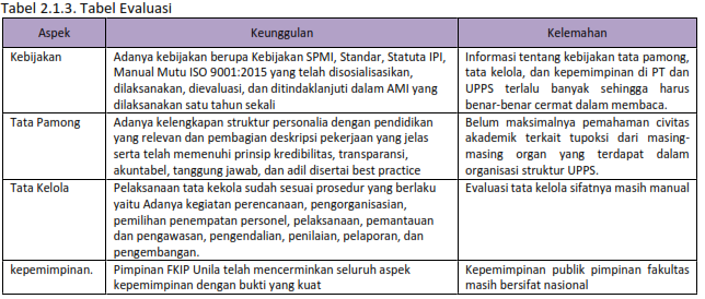 Evaluation of governance, management, and leadership policies and implementation at UPPS. Evaluation of governance, management, and leadership policies and implementation at FKIP Unila is conducted every semester in a structured and planned manner. The results of the evaluation up to 2024 are presented in Table 2.1.3 below: