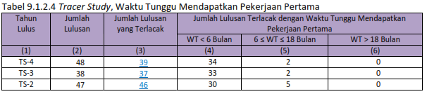 The number of PSPF graduates tracked with the waiting time to obtain their first job is a benchmark for the achievement of IKU 1 at the University of Lampung [evidence]. The tracer study was conducted by the UPT Center for Career and Entrepreneurship Development (CCED) at the University of Lampung through [evidence] carried out periodically once a year. The questionnaire used by CCED has components that are in line with the DIKTI tracer study related to measuring the speed of obtaining employment, the relevance of skills possessed to industry needs, and the level of user satisfaction. Information on filling out the tracer study is shared with all graduates through alumni groups and disseminated at the PSPF Alumni Gathering [evidence]. The tracer study report is conducted regularly through the Tracer Study Report Socialization at the faculty level [evidence], and at the study program level, the tracer study results can be accessed through [link; evidence] with a username and password accessible to the Head of the Study Program and TPMPS PF. The tracer study results data, the number of graduates tracked, and the waiting time to get their first job are shown in Table 9.1.2.4.